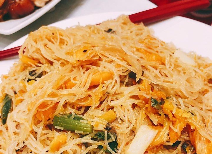 「炒南瓜米粉」是將蒸過的南瓜拌碎再放入米粉一同拌炒,金黃色澤令人垂涎,是一道營養健康的台灣古早味。