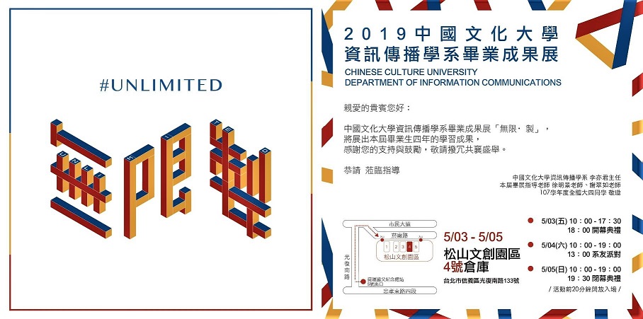 【民生頭條】中國文化大學資訊傳播學系2019年畢業成果展-「無限·製」,於5月3日至5月5日在松山文創園區4號倉庫熱鬧展開。資傳系主任李亦君開心地說:「歡迎大家來到松山文創園區,讓我們與您一同體驗網路時代的資訊傳播新風貌。」