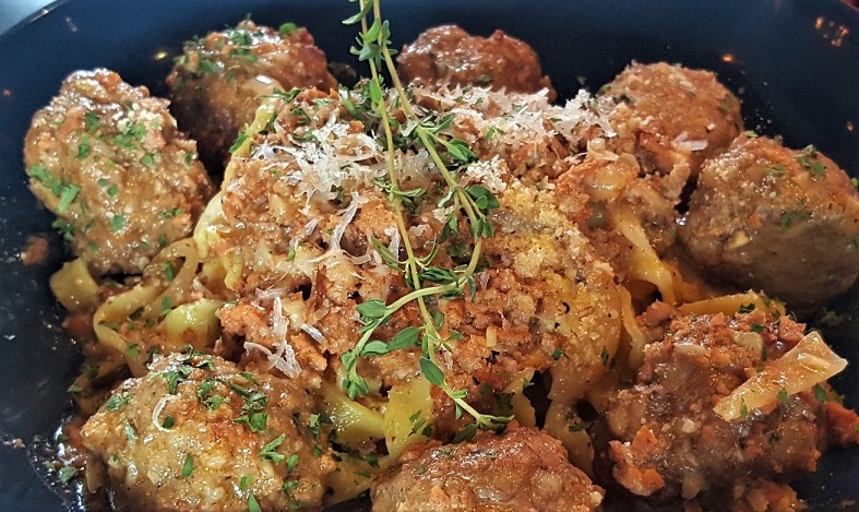 餐酒館另外推介,使用伊比利臘腸製作、擁有纖細口感但風味層次十足的「臘腸肉醬寬扁變佐手工肉丸」,這款麵品端上桌一樣很誇張,高爾夫球大小的肉丸舖滿了盤面,差點看不到麵。