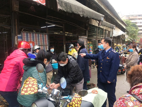 2月4日,鮑林(右,穿制服者)在百色市城西農貿市場勸導疏散搶購活禽的消費者。
