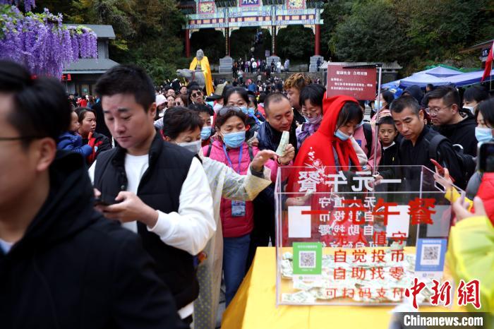 10月4日,河南洛陽,無人值守一元午餐在老君山景區持續上崗,從今年的國慶長假開始,這已經是第四天供應一元午餐了,也是該景區國慶假期連續推行一元午餐的第四年。