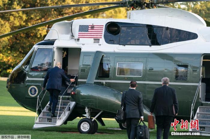 - 資料圖:當地時間10月2日下午,美國總統特朗普在確診感染新冠病毒后首度公開亮相。他當天下午從白宮乘機前往馬里蘭州軍事醫院進行治療。
