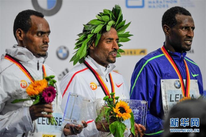 資料圖:在2019柏林馬拉松賽中,埃塞俄比亞选手凱內尼薩-貝克勒(中)以2小時1分鐘41秒的成績奪得男子組冠軍。圖片來源:新華網 新華社記者連振攝