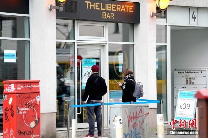 資料圖:人們在柏林一家酒吧改成的新冠抗原快速檢測點外等候檢測。中新社記者 彭大偉 攝
