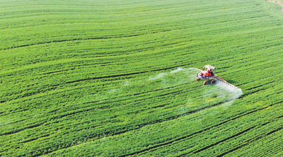 日前在湖北省襄陽市高新技術產業開發區李沖村,大型植保机械在麥田噴洒農藥和恭弘=叶 恭弘面肥。