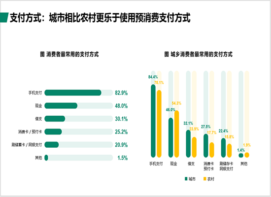 總體來看,82.9%的消費者最常用的支付方式是手機支付,其次是48%的消費者採用現金支付和30.1%的消費者採用借支支付。城市相比農村更樂於使用預消費支付方式,如借支和預付卡。