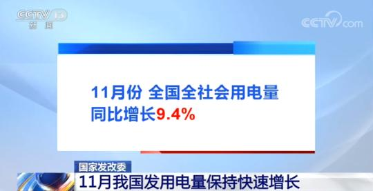 用電量向來是經濟運行的“風向標”。記者從國家發展改革委舉行的新聞發布會上了解到,11月份我國發用電量保持快速增長。從發電量看,11月份,全國規模以上工業發電量同比增長6.8%,增速比上月提高2.2個百分點。從用電看,11月份,全國全社會用電量同比增長9.4%,增速比上月提高2.8個百分點,显示出我國工業生產保持旺盛態勢。