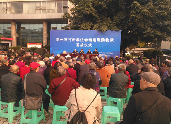 11月2日上午,彭州市市場和質量監管局辦公大樓前,100多位頭髮花白的老人早早來到這裏,整齊地坐在凳子上,等待一場特殊儀式的開始。主席台後的藍色背景板上寫着“彭州市打擊非法會銷追繳購物款發放儀式”。桌上堆放的76萬元巨額現金,原本是老人們的退休工資,如今失而復得。
