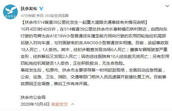 中新網10月4日電 據吉林省扶余市人民政府新聞中心官方微博消息,扶余市公安局4日晚就扶余市514省道39公里處發生的重大道路交通事故有關情況作出說明。10月4日5時40分許,在514省道39公里處扶余市長春嶺鎮石橋村附近,由西向東行駛的號牌為吉A1E19W小型普通貨車撞至前方同向行駛的農用四輪拖拉機尾部后駛入對向車道,與對面駛來的吉JMK350小型普通貨車相撞。目前,該起事故致18人死亡,1人受傷。