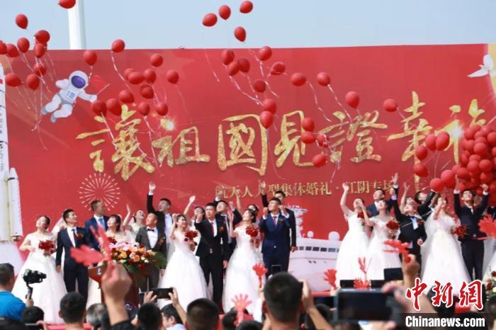 10月1日,長江江畔,16對航天人伉儷在祝福聲中邁入幸福之門。 中國衛星海上測控部供圖 攝