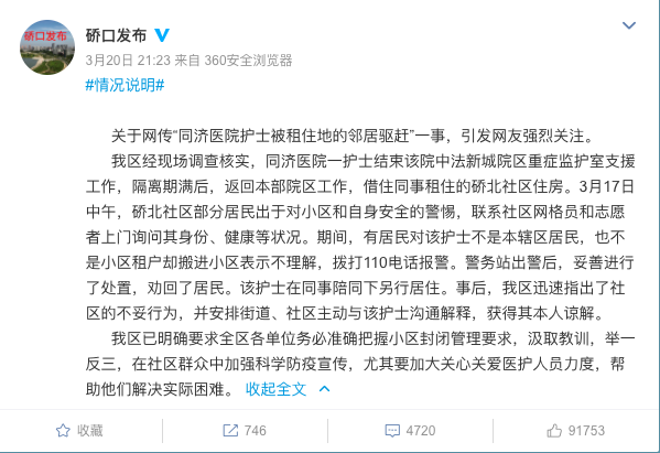 人民網北京3月21日電 據硚口發布微博消息,3月20日,武漢市硚口區委宣傳部在其官方微博通報稱,關於網傳“同濟醫院護士被租住地的鄰居驅趕”一事,引髮網友強烈關注。事後,硚口區迅速指出了社區的不妥行為,並安排街道、社區主動與該護士溝通解釋,獲得其本人諒解。